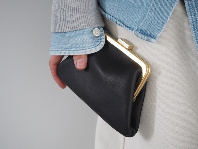 真鍮製のがま口金具を使用した長財布 使用の革はタンニンなめしでありながら しなやかでしっとりとした手触りの革を使用。 染色工程で蝋を染み込ませてあり 黒の中にも奥行き・透明感のある発色が特徴です。 この革と好相性の金具は真鍮ならではの艶、音の響き、重厚感のある口金です。 鉄製とは異なる手触りも魅力です。 革も真鍮も使うほどに色の変化や質感の変化が現れます。使う人によってその味わいはそれぞれ。 自分だけのお気に入りの道具を育てる楽しみがあります。 口金、ナスカンなどの接続金具も真鍮のものを使用しております インナーケースはシンプルなシングルタイプとダブルからお選びいただけます。 サイズ タテ 約10.5cm(げんこ含まず) ヨコ 約14.0cm 底の一番広い部分 マチ 約4.0cm 口金の仕様変更は無くなりました、四角いげんこ継続です。